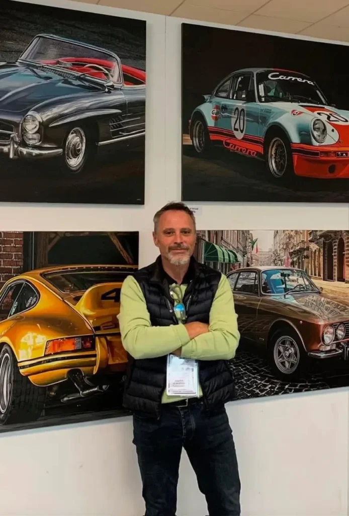This is his signature, the acronym with which he concludes and certifies the authenticity of all his artistic creations, performed mainly using acrylic paints on canvas, and which has now become the identifying and unmistakable figure of his typical hyperrealistic pictorial technique that he prefers, but on which he has not crystallized, often and willingly also experimenting decisive turns towards different expressive registers, passing from the transparencies of the glass of the glasses and bottles, to the reflections in the water or those superimposed ones of the windows of the chaotic urban landscapes of the big cities, up to the completely unreal representations proposed by artificial intelligence.